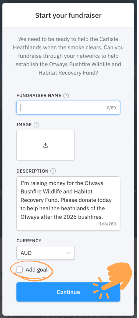Enter what you want the name of your fundraiser to be. Add a image and a description (or keep the one there). If you want to add a goal amount and end date - click Add goal. Enter the amount and date and click Continue.