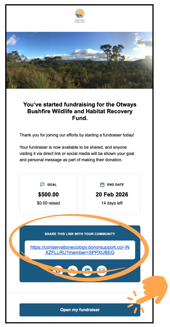 Your fundraising page is complete! To share your fundraiser with your friends and family, just copy the link and paste it in a message, an email, on Facebook, on WhatsApp…anywhere!